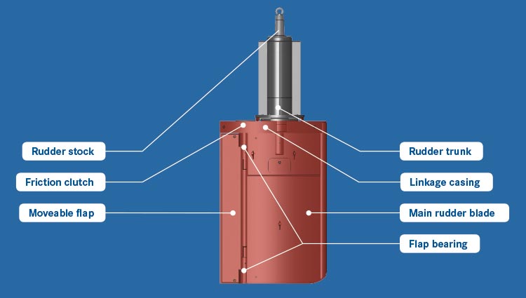 Enhanced safety is achieved via an overload protection of the rudder flap, which prevents both the mechanism from being damaged as well as the rudder from being rendered inoperable due to flap blockages and obstruction. The integrated friction clutch protects the rudder flap against any damage from outside. In case the rudder flap becomes struck, the clutch will slip and give way to the overload. The flap will self-centre after the rudder is steered hard portside and starboard.