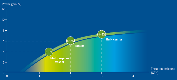 Above: Potential savings and the correlation between power savings and ship size of a Becker Mewis Duct®.