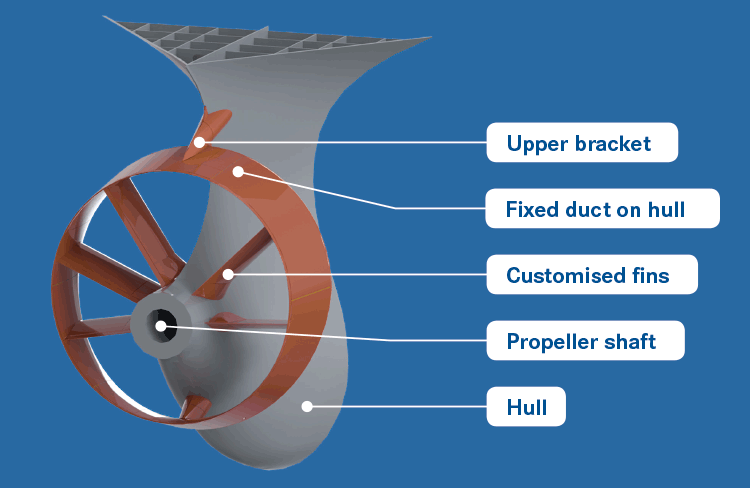 The Becker Mewis Duct® consists of two strong fixed elements mounted on the vessel: a duct positioned in front of the propeller along with an integrated fin system. The duct straightens and accelerates the hull wake into the propeller and also produces a net forward thrust. The fin system provides a pre-swirl to the ship wake which reduces losses in the propeller slipstream, resulting in an increase in propeller thrust at a given propulsive power. Both effects contribute to one another. The power savings attainable from the Becker Mewis Duct® are strongly dependent on propeller thrust loading, from 3 to 8% depending on individual hull/propeller interaction. The power savings are virtually independent of ship speed. The Becker Mewis Duct® is ideally suited to both new-build and retrofit applications (e.g. tankers, bulkers and MPCs).