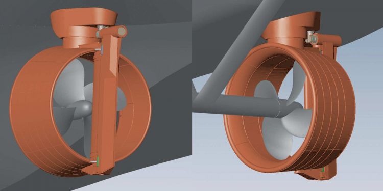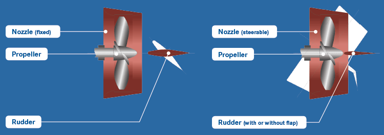 The steerable nozzle demonstrates greatly improved manoeuvring performance by generating higher lateral forces. Less space is needed for the overall propulsion arrangement and better efficiency is achieved by placing the propeller further to the rear than the fixed nozzle. The steerable nozzle guarantees the highest pull combined with excellent manoeuvring performance.